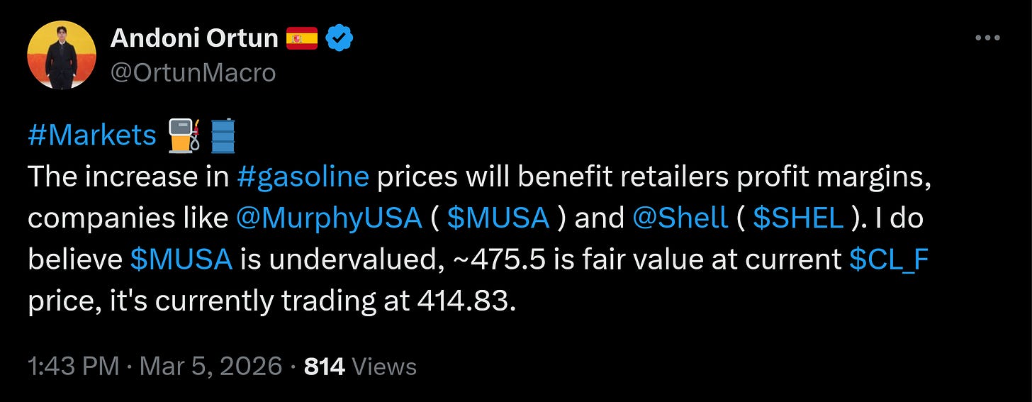 This doesn’t mean that there isn’t opportunity in this war; oil remains a hedge on this war, but as I mentioned before, munition maker stocks are undervalued as long as this war continues. My main hedge for this war was gasoline retailers like Murphy USA Inc. ( MUSA 0.00%↑ ) stock, which surpassed my price target, I do still believe it’s undervalued.